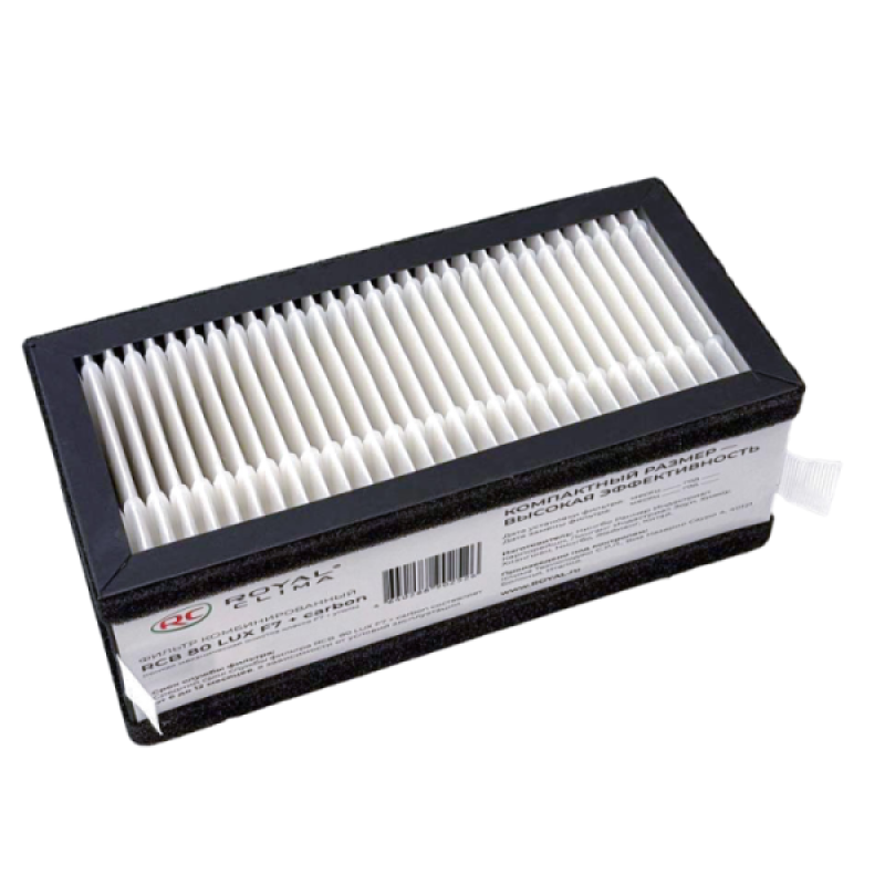 Фильтр RCB 80 LUX F7+carbon – в одном корпусе соединен фильтр класса F7 и угольный фильтр. Фильтр тонкой очистки удерживает частицы меньше 0,4 мкм со средней эффективностью до 50%. Фильтр F7 способен задержать такие частицы как: частицы краски, ржавчины, пыль среднего и мелкого размера, частицы стекла, а также пух и пыльцу некоторых растений.