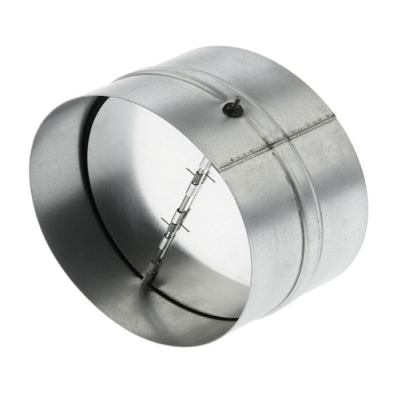 Обратный клапан с подпружиненными лопастями предназначен для автоматического перекрывания круглых воздуховодов при отключении систем вентиляции. Корпус клапана выполнен из оцинкованной стали, лопасти из листового алюминия. Крепление клапана к другим элементам системы вентиляции производится при помощи ниппельного соединения. Клапан может быть установлен в вертикальном положении.